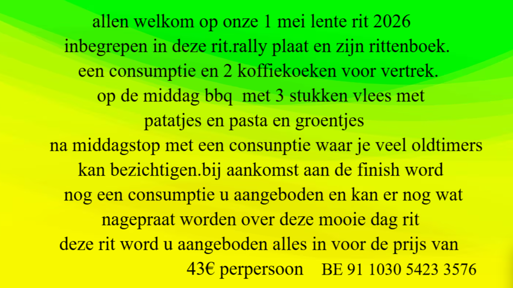 We nodigen u van harte uit voor onze 1 mei rit te Beernem, georganiseerd door de Vlaamse Oldtimer Vrienden. Op vrijdag 1 mei trekken we eropuit langs prachtige wegen in West- en Oost-Vlaanderen. Iedereen is welkom om deel te nemen aan deze gezellige lenterit.